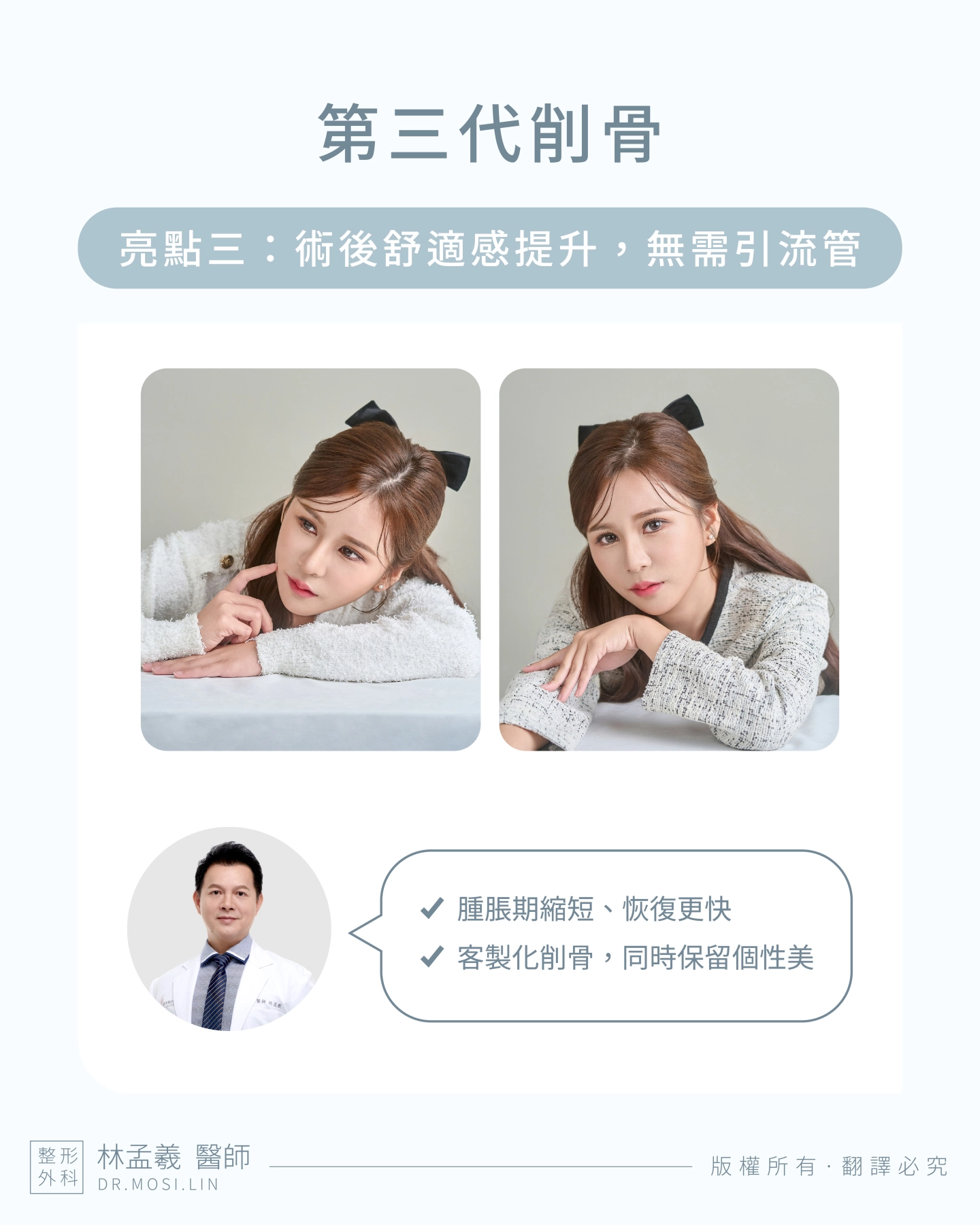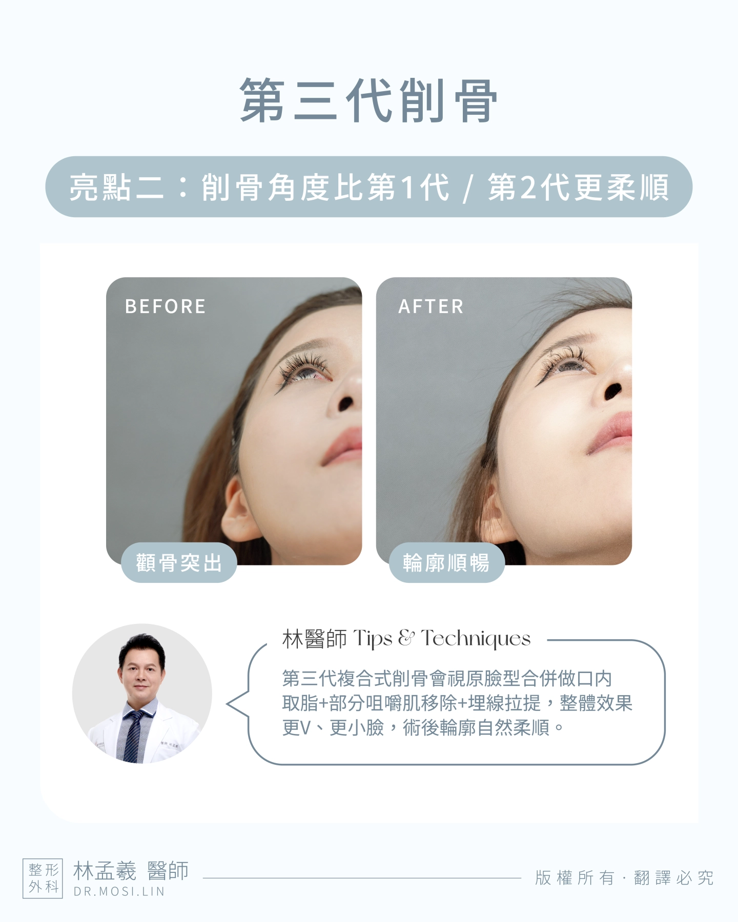 而林孟羲醫師所設計的第三代削骨則走向完全不同方向 ——柔和、自然、整體提升。