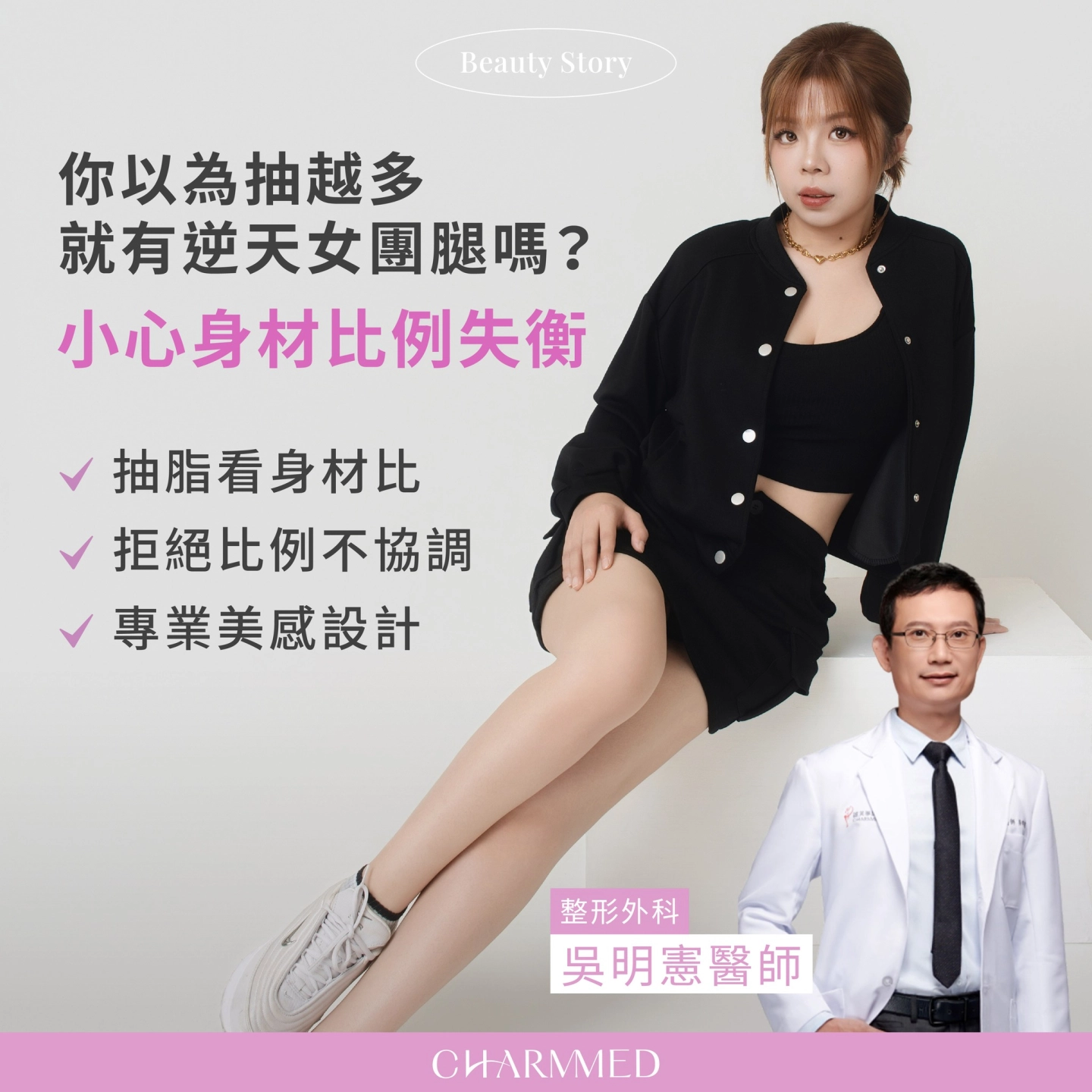 超過25年臨床經驗的資深整形外科 吳明憲醫師分享他在門診咨詢中,許多來諮詢大腿抽脂的族群,第一句常問的是:「醫師,我這樣是不是要抽多一點才會顯得瘦、才會好看?」其實真正好看的身形,從來不是脂肪抽得最多,而是比例最協調。