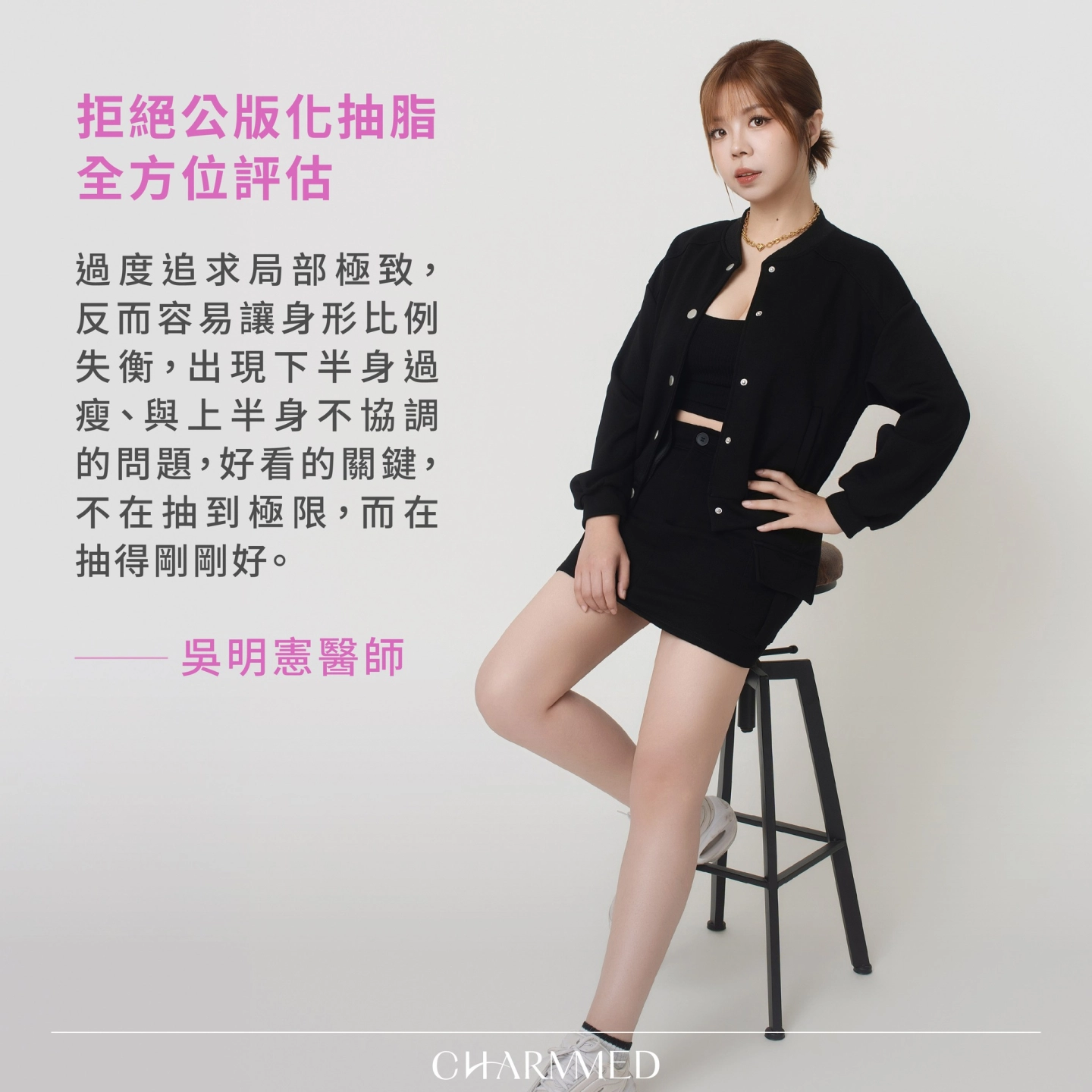 「抽脂不是抽越多越好,而是抽得剛剛好,讓身體比例看起來更順。不過度抽脂、不製造人工感,讓身型比例在時間中依然自然,是體雕真正的價值。」