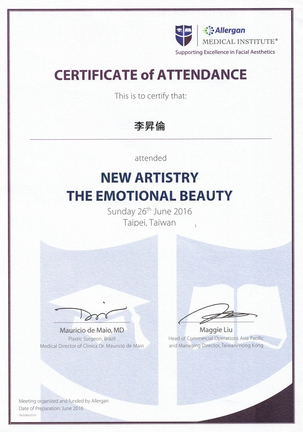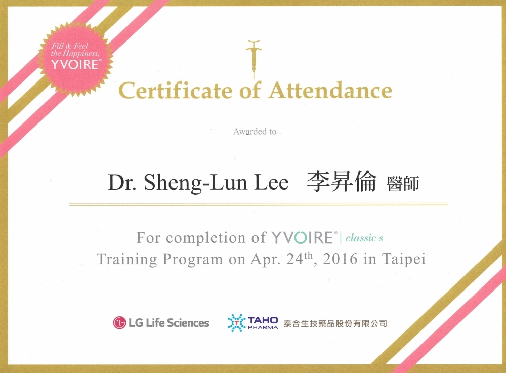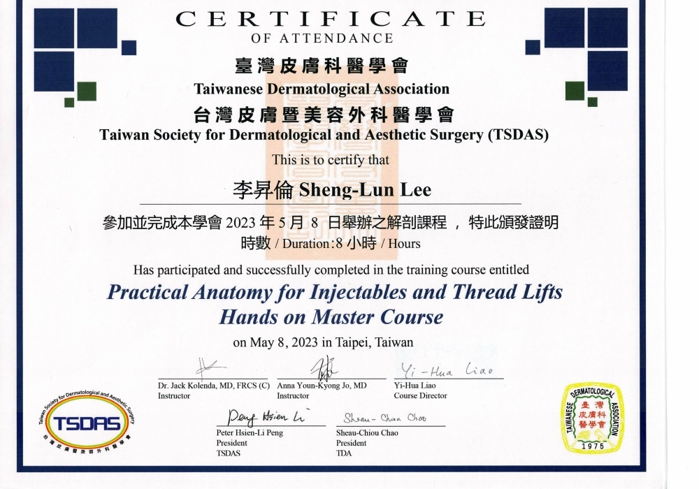 - 台灣皮膚暨美容外科醫學會解剖課程結業證