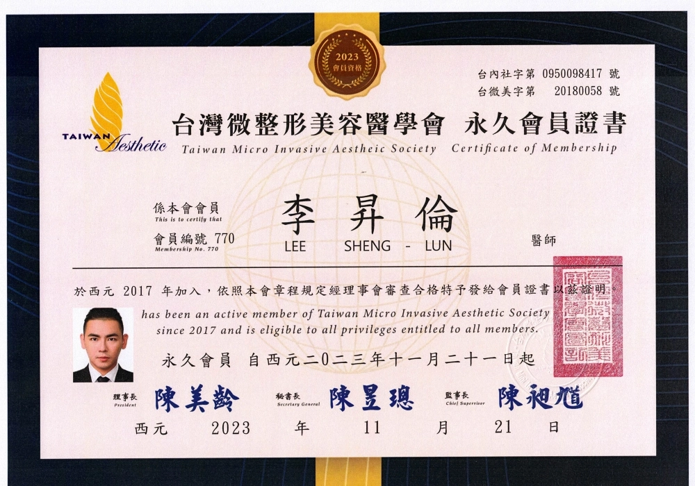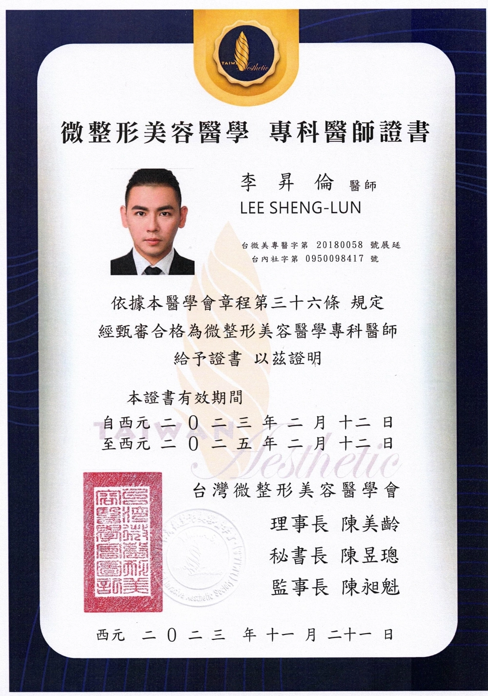 - 台灣微整形美容醫學會認證醫師(台美專醫字號20180058號)