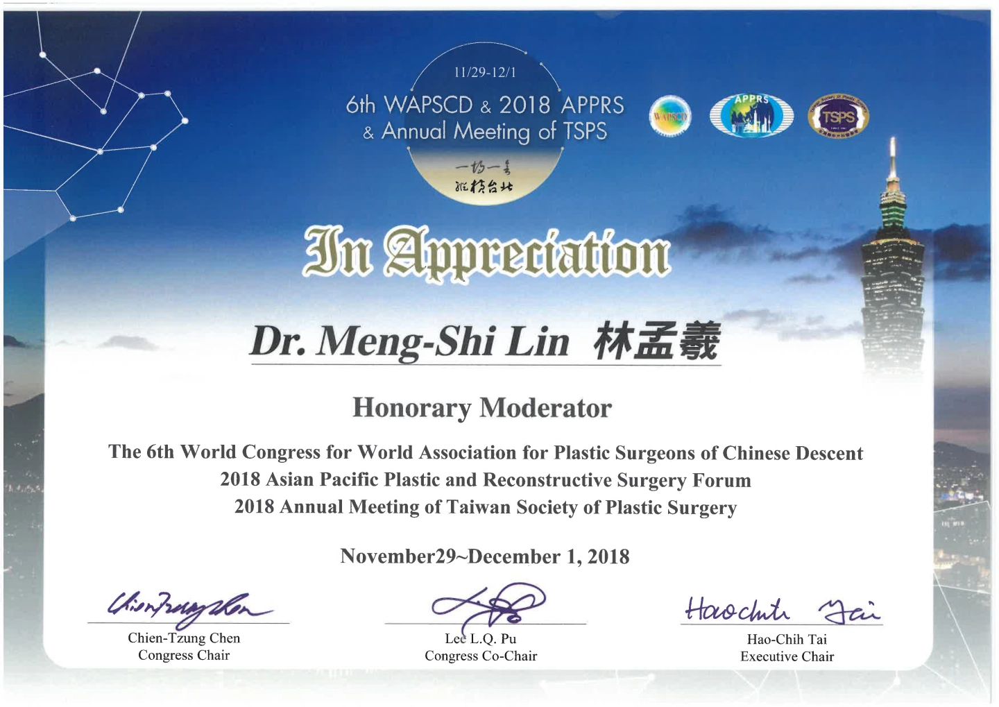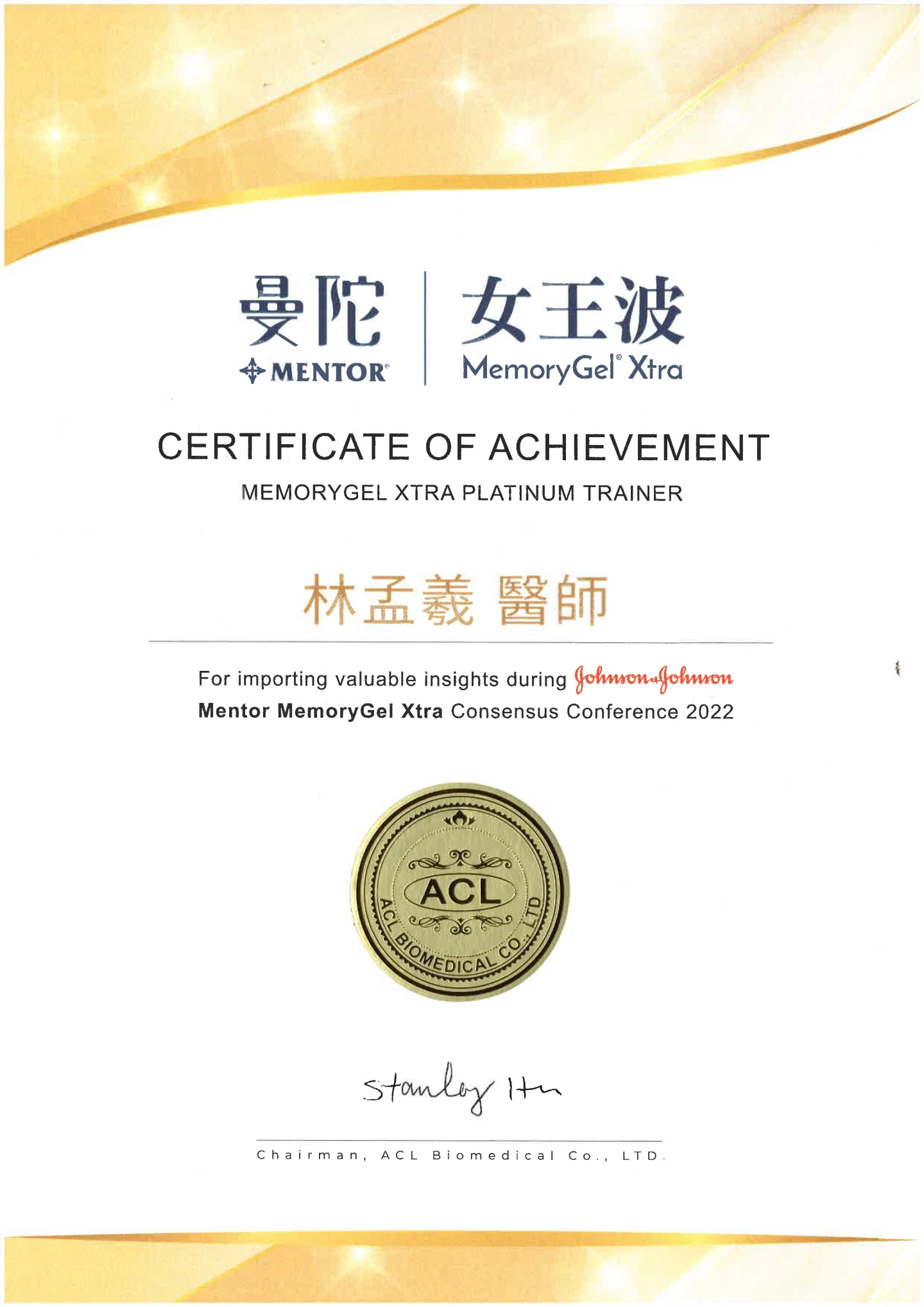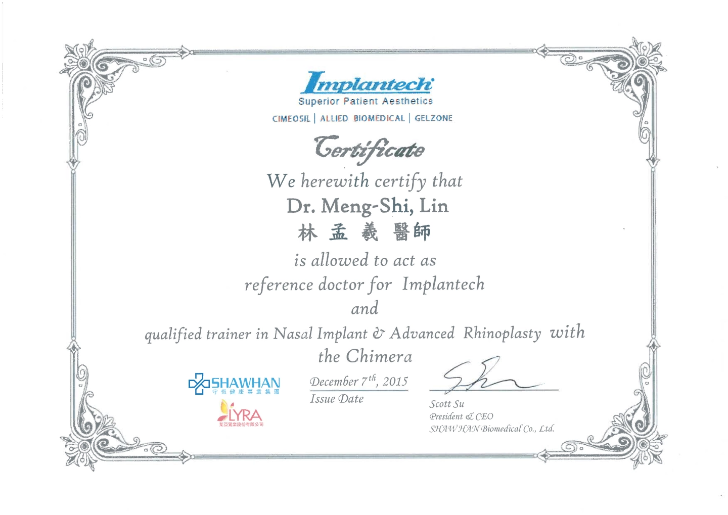 - 中華民國整形外科專科醫師(整專醫字第000375號)
