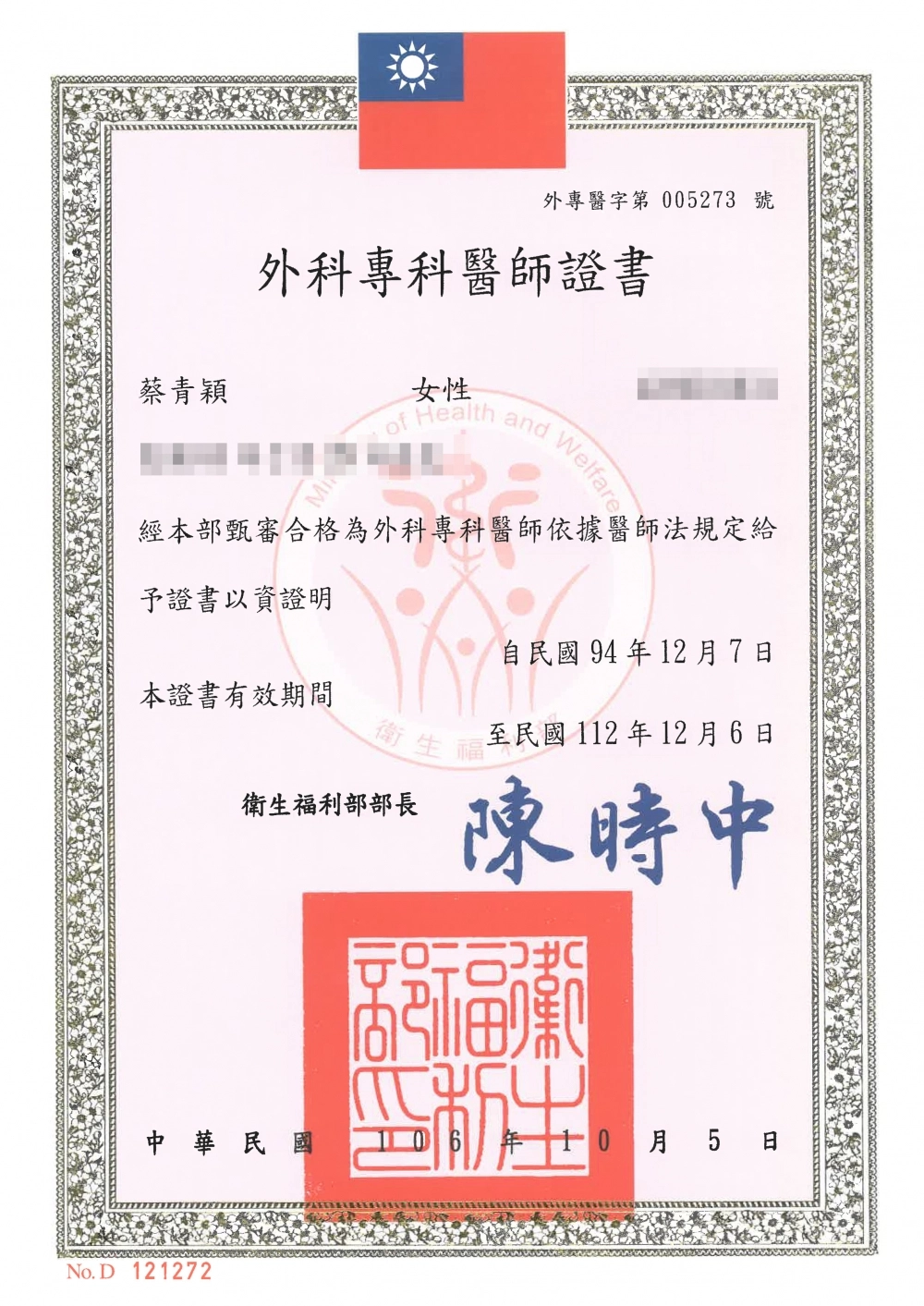 - 中華民國外科專科醫師證書(外專醫字005273號)