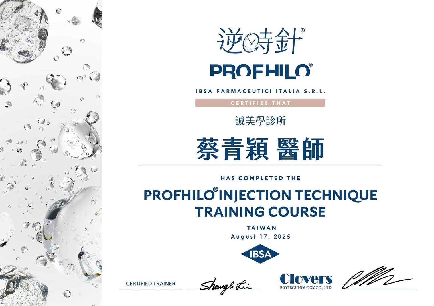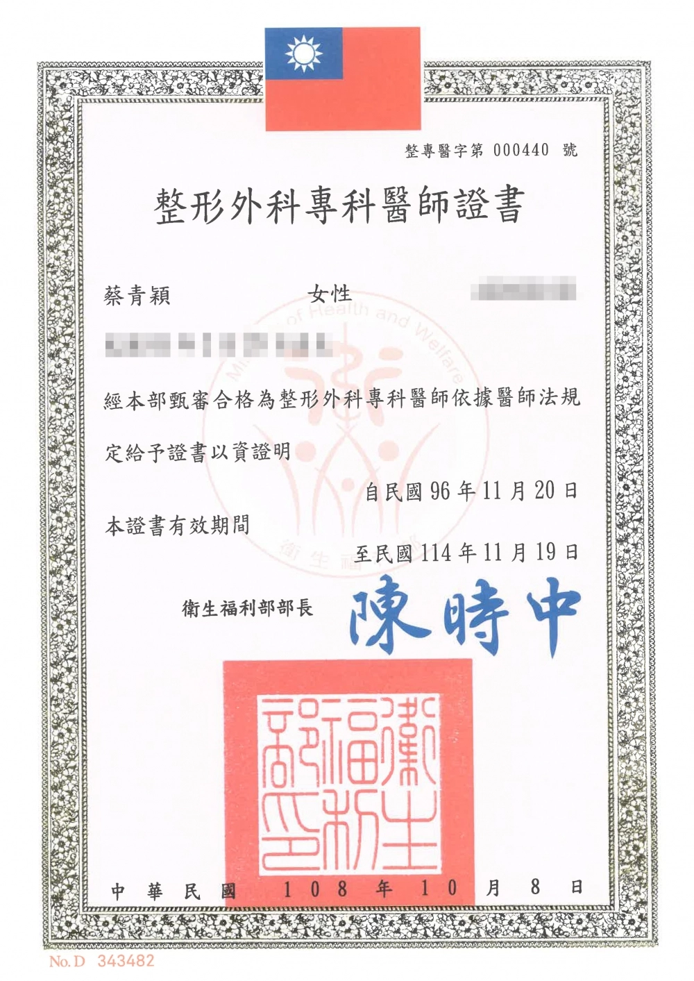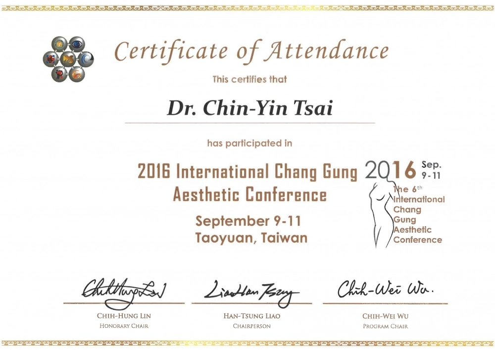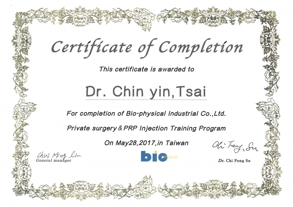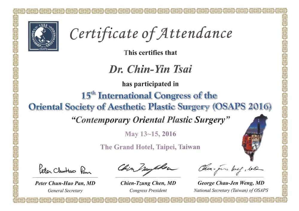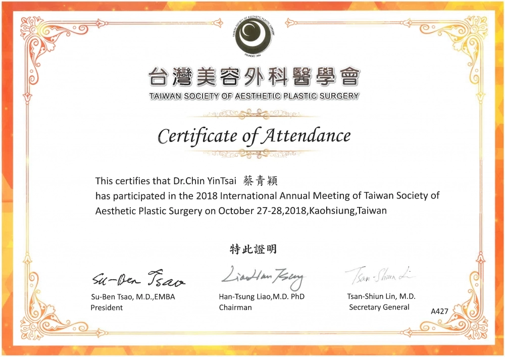 - 中華民國整形外科專科醫師(整專醫字第000440號)